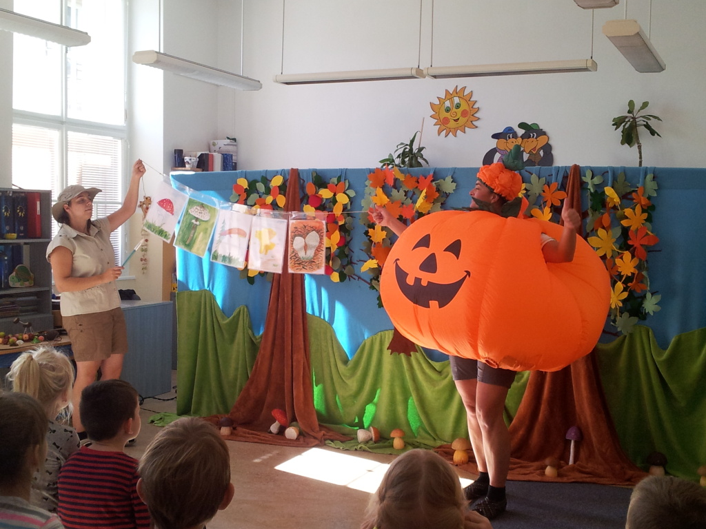Ve čtvrtek 27. září k nám přijelo divadlo Letadlo s pohádkou „V korunách stromů“. Pan Podzim (kterého si zahrál náš Jindra) nám vykouzlil pestrou a zářivou paletu barev. S veverkou a strakapoudem jsme si povídali a zazpívali o změnách v přírodě. Rozloučili jsme se s vlaštovkami, opekli si bramboru v řeřavých uhlících, zasmáli jsme se obrovské dýni, zasoutěžili si ve sběru hub a dokonce si i „zaběhali“ s draky. Pohádka byla nejen zábavná, ale hlavně poučná.
