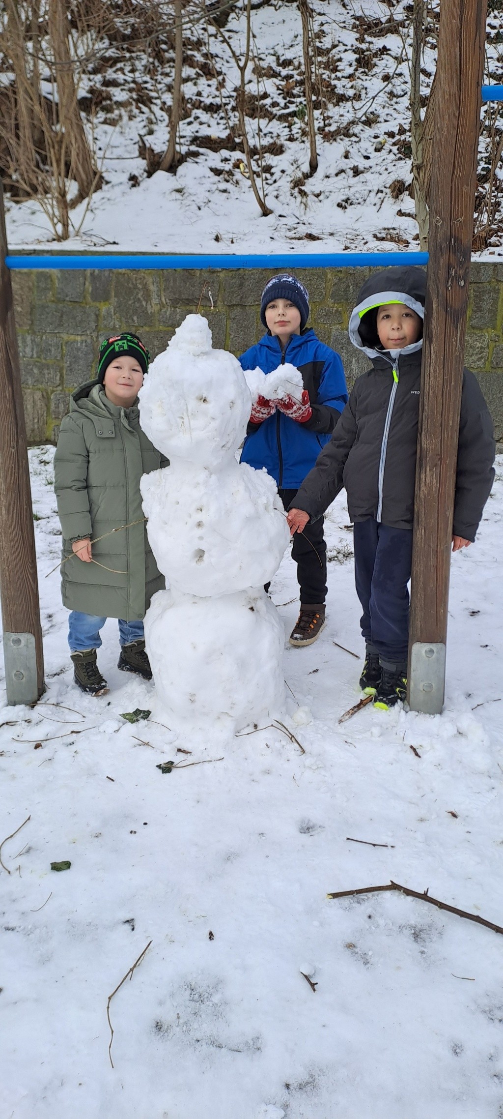 Po návratu z vánočních prázdnin jsme si užili první sněhové nadílky. Sníh nám sice rychle roztál, ale postavit sněhuláky, uspořádat závodění na lopatách i koulovačku jsme stihli.