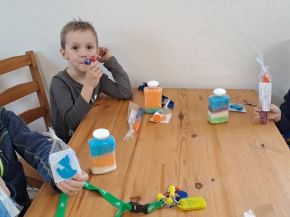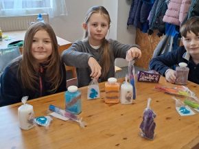 V úterý 21. ledna jsme navštívili Svíčkárnu Rodas v Liticích. Hned u vstupu jsme se pozdravili s Ferdou (agama) a andulkou, a pak už jsme si mohli vyzkoušet vlastní šikovnost při vykrajování mýdla, plnění lahvičky voňavou koupelovou solí, obarvit a ozdobit si svíčky barevnou polevou dle libosti. Celý program proběhl v příjemné atmosféře, personál svíčkárny byl vstřícný a trpělivý.
